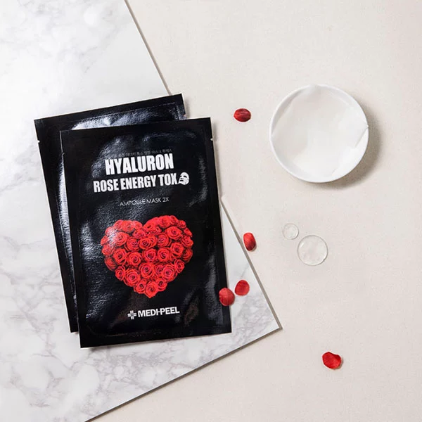 Ампульна тканинна маска Medi-Peel Hyaluron Rose Energy Tox Ampoule Mask з екстрактом троянди чинить глибокий антивіковий вплив, сповільнюючи процес старіння шкіри. Ефективність цього косметичного засобу ґрунтується на зменшенні вираженості мімічних зморшок, поглибленні шкірних складок і зниженні їх числа.