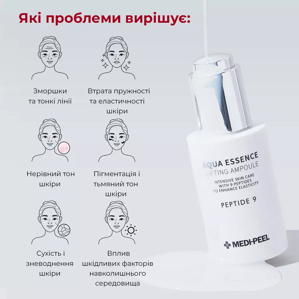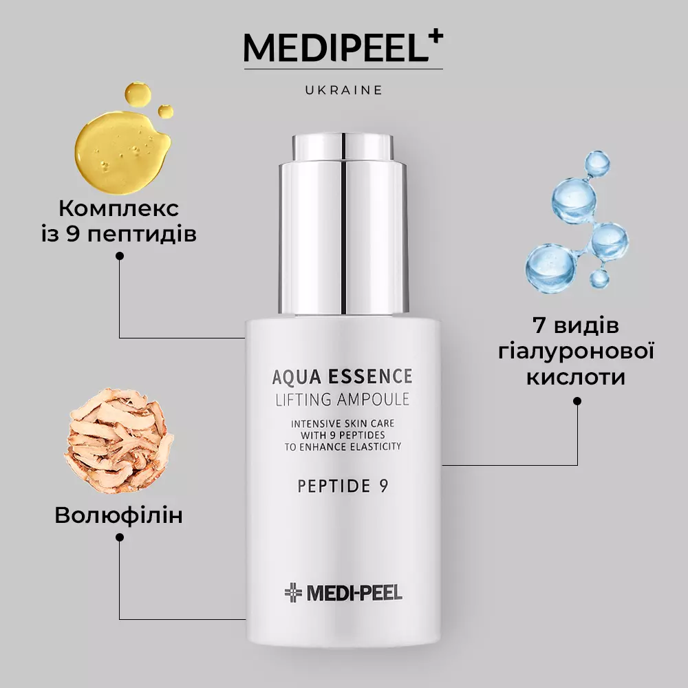 MediPeel Peptide 9 Aqua Essence Lifting Ampoule володіє комплексною дією, яка допомагає розв'язати багато проблем шкіри, зробити її здоровішою і красивішою.