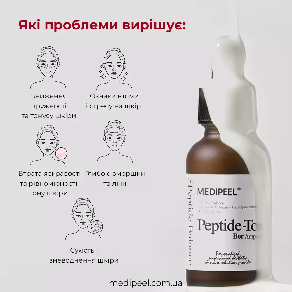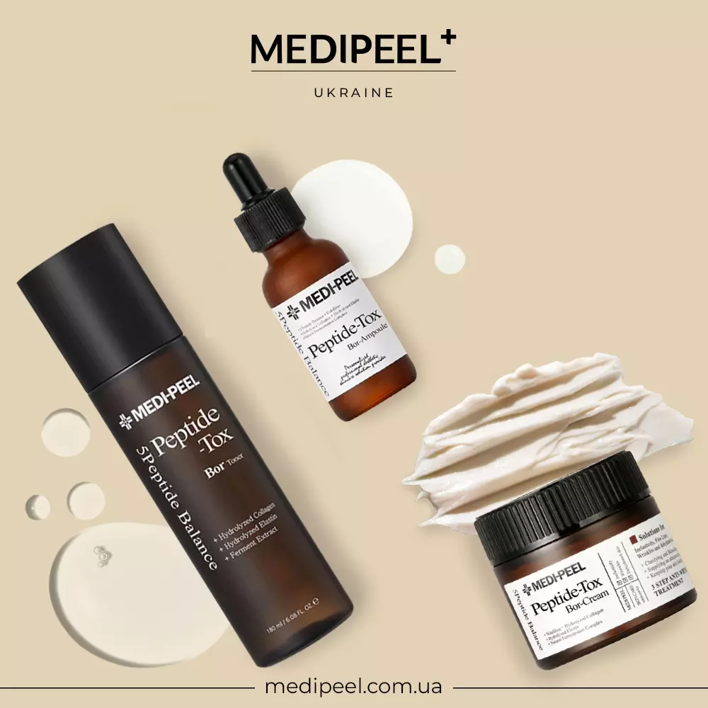 - Ліфтинг-тонер для обличчя Medi-Peel Peptide-Tox Bor Toner: Цей революційний тонер збагачений потужним пептидним комплексом, який інтенсивно зволожує шкіру, відновлюючи її тонус і еластичність. Його легка формула миттєво вбирається, залишаючи відчуття свіжості й готуючи шкіру до подальшого догляду.