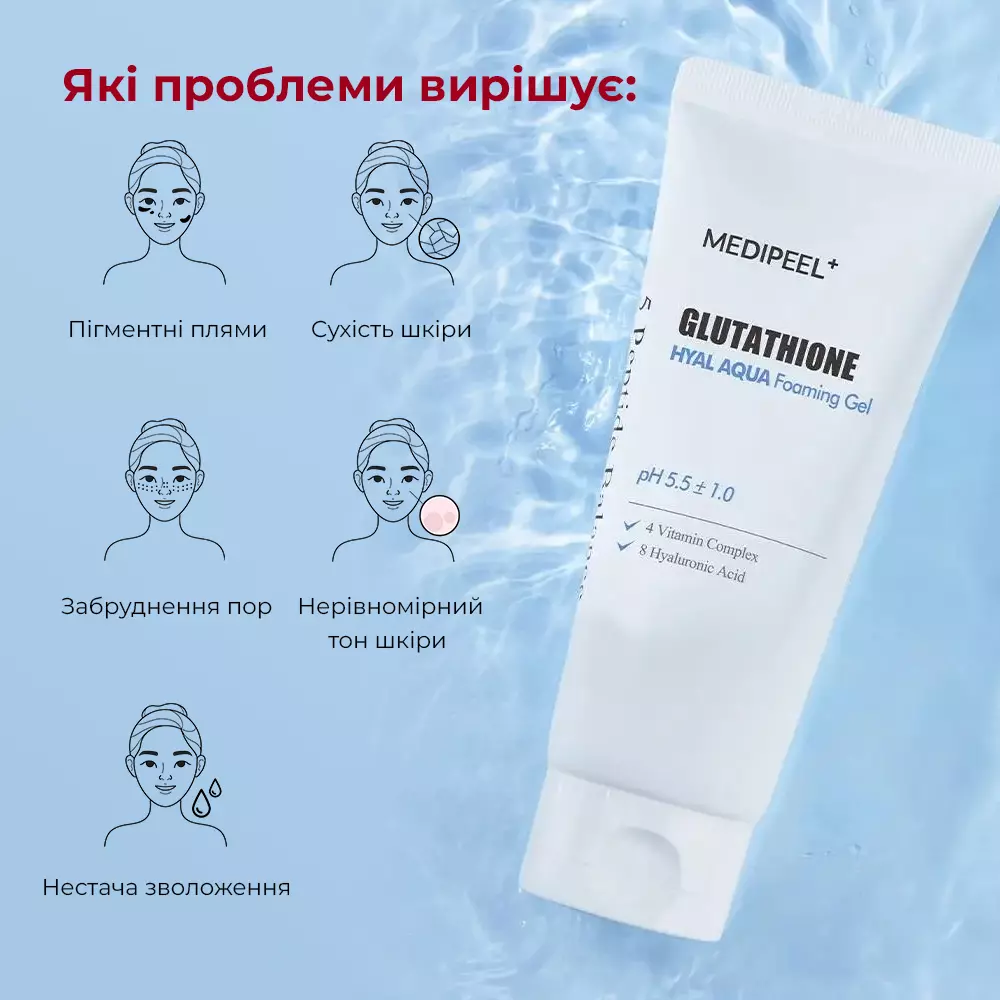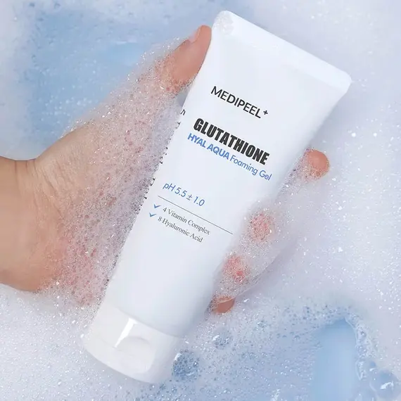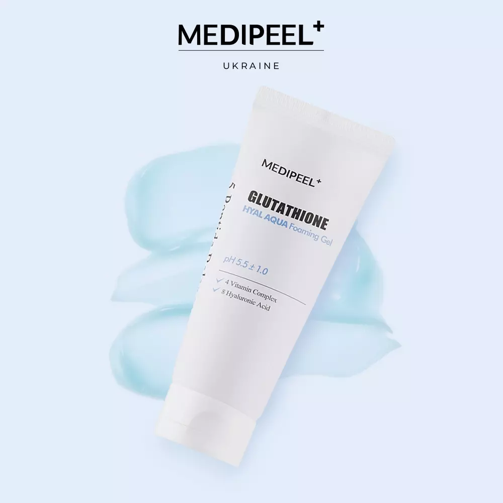 Medi Peel Glutathione Hyal Aqua Foaming Gel - це слабокислотний гелевий засіб для вмивання, що ідеально підходить для підтримки здоров'я і зволоженості вашої шкіри навіть після процедури очищення.