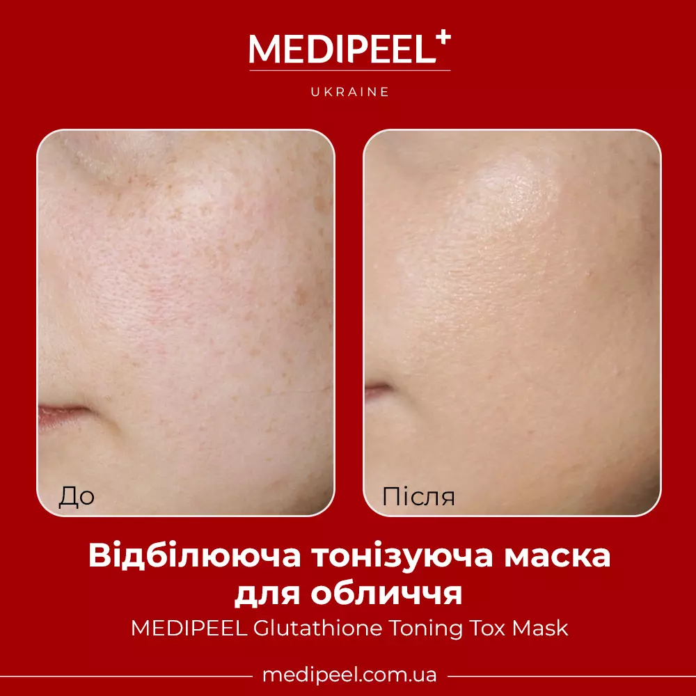 Відбілювальна маска MEDIPEEL Glutathione Toning Tox Mask - ефективне рішення для боротьби з пігментацією, тьмяністю і нерівним тоном шкіри.