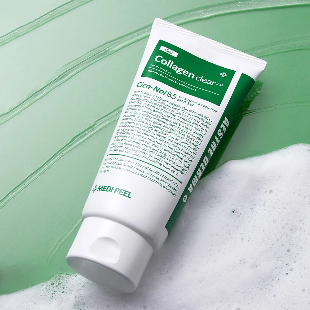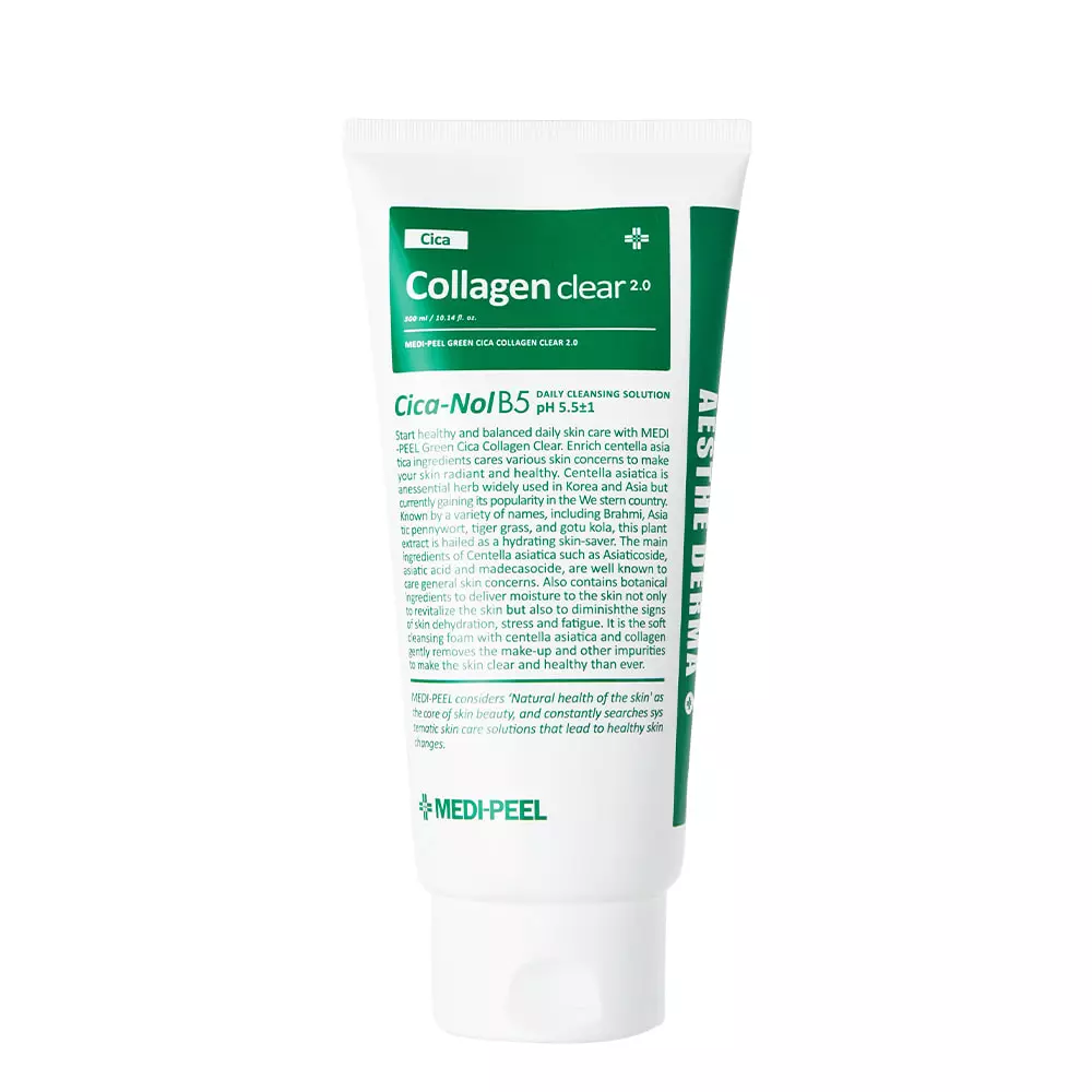 Колагенова пінка для вмивання Medi-Peel Green Cica Collagen Clear 2.0 з CICA-комплексом забезпечує глибоке очищення шкіри, виключаючи відчуття стягнутості та подразнення. Цей продукт ефективно усуває почервоніння, сприяє заспокоєнню шкіри і вирівнюванню її тону.
