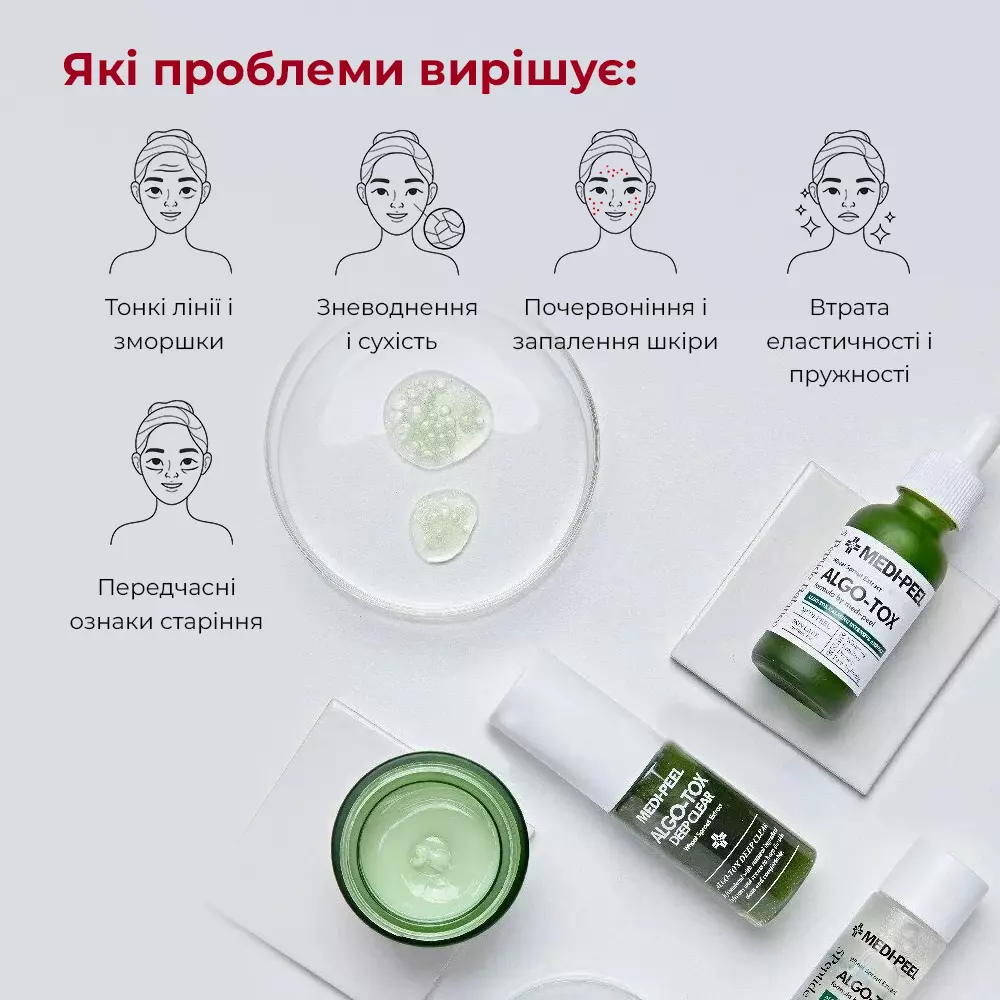 - Щиро дякуємо за ваш відгук! Раді чути, що Algo-Tox Multi Care Kit забезпечив саме той ефект, якого потребує проблемна й чутлива шкіра — миттєве зволоження без жирності та легкий приємний аромат. Цей набір створений для делікатного, але глибокого догляду, і ми дуже раді, що він вам підійшов. Дякуємо за довіру до MEDIPEEL Ukraine — нехай ваша шкіра щодня залишається здоровою, свіжою й збалансованою!