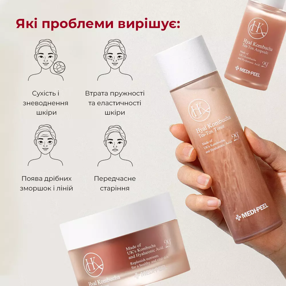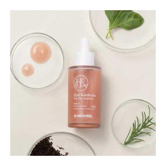 - Medi-Peel Hyal Kombucha Tea-Tox Ampoule - концентрована сироватка, яка містить зволожувальну гіалуронову кислоту і відновлювальний екстракт комбучі. Ця формула діє на клітинному рівні для посилення процесу регенерації шкіри, забезпечуючи їй глибоке зволоження і відновлення еластичності.