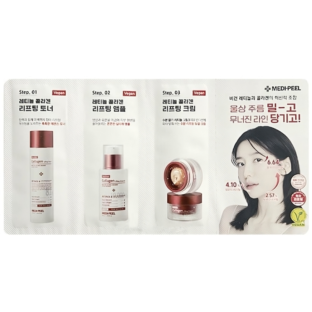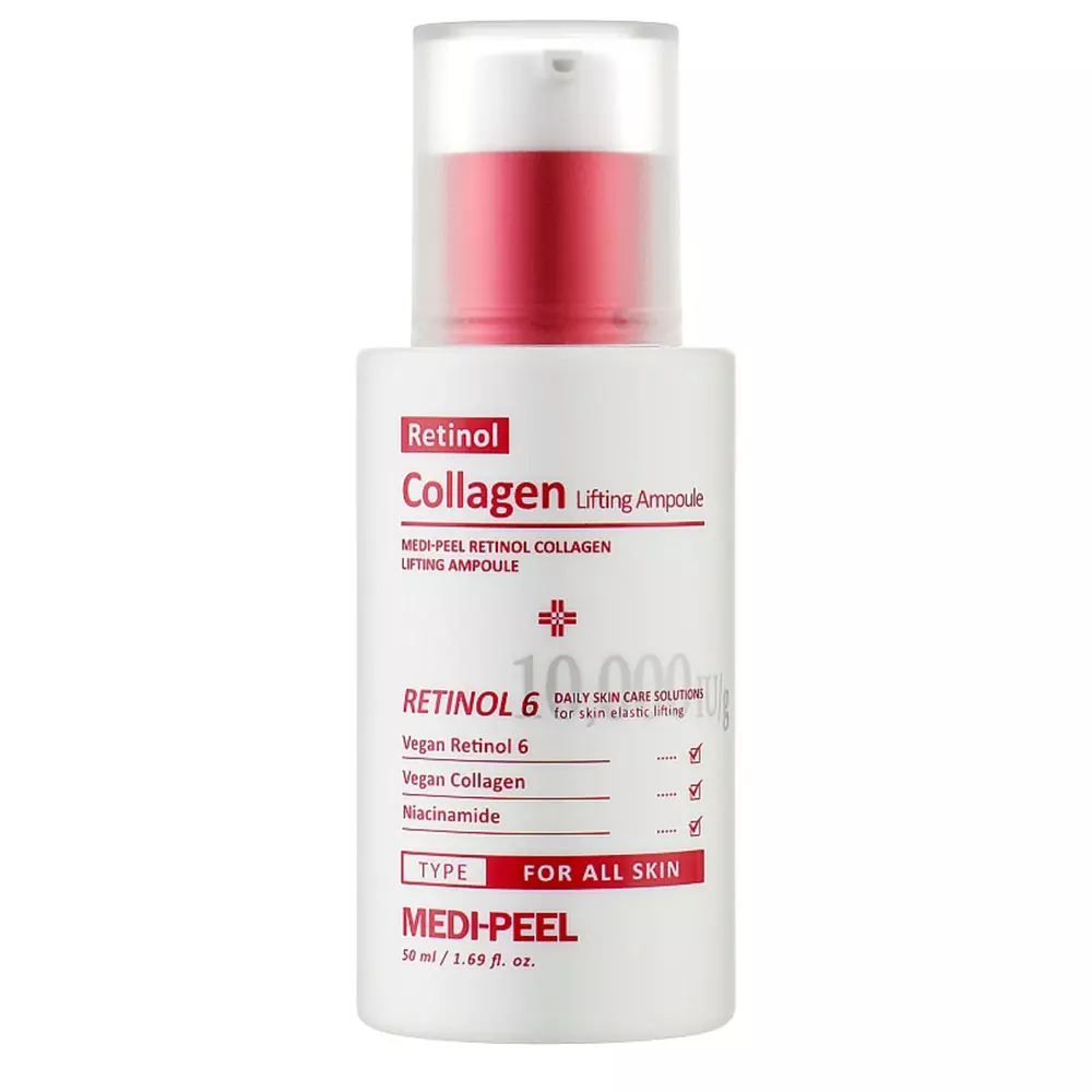 - MEDIPEEL Retinol Collagen Lifting Ampoule: Концентрована сироватка посилює синтез колагену та сприяє зменшенню видимості зморшок, роблячи шкіру більш пружною та сяючою.