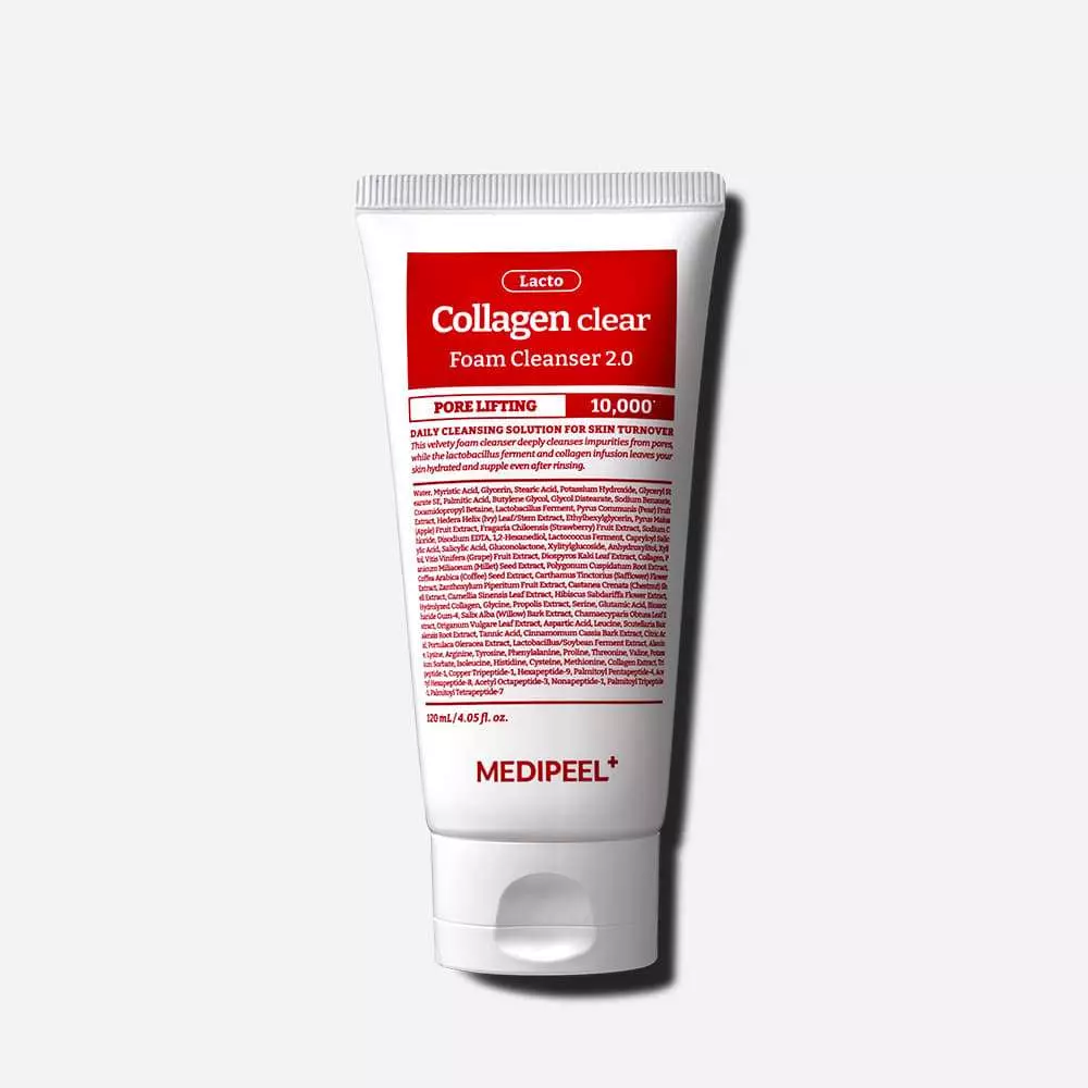 MEDIPEEL Red Lacto Collagen Clear Foam Cleanser 2.0 - ідеальний засіб для глибокого очищення та турботи про шкіру, забезпечуючи комплексний догляд, який очищує, звужує пори та сприяє їхньому здоров'ю. Формула, заснована на AHA і BHA кислотах, делікатно видаляє відмерлі клітини шкіри, забруднення та надлишок шкірного жиру, допомагаючи досягти чистоти та гладкості з першого застосування.