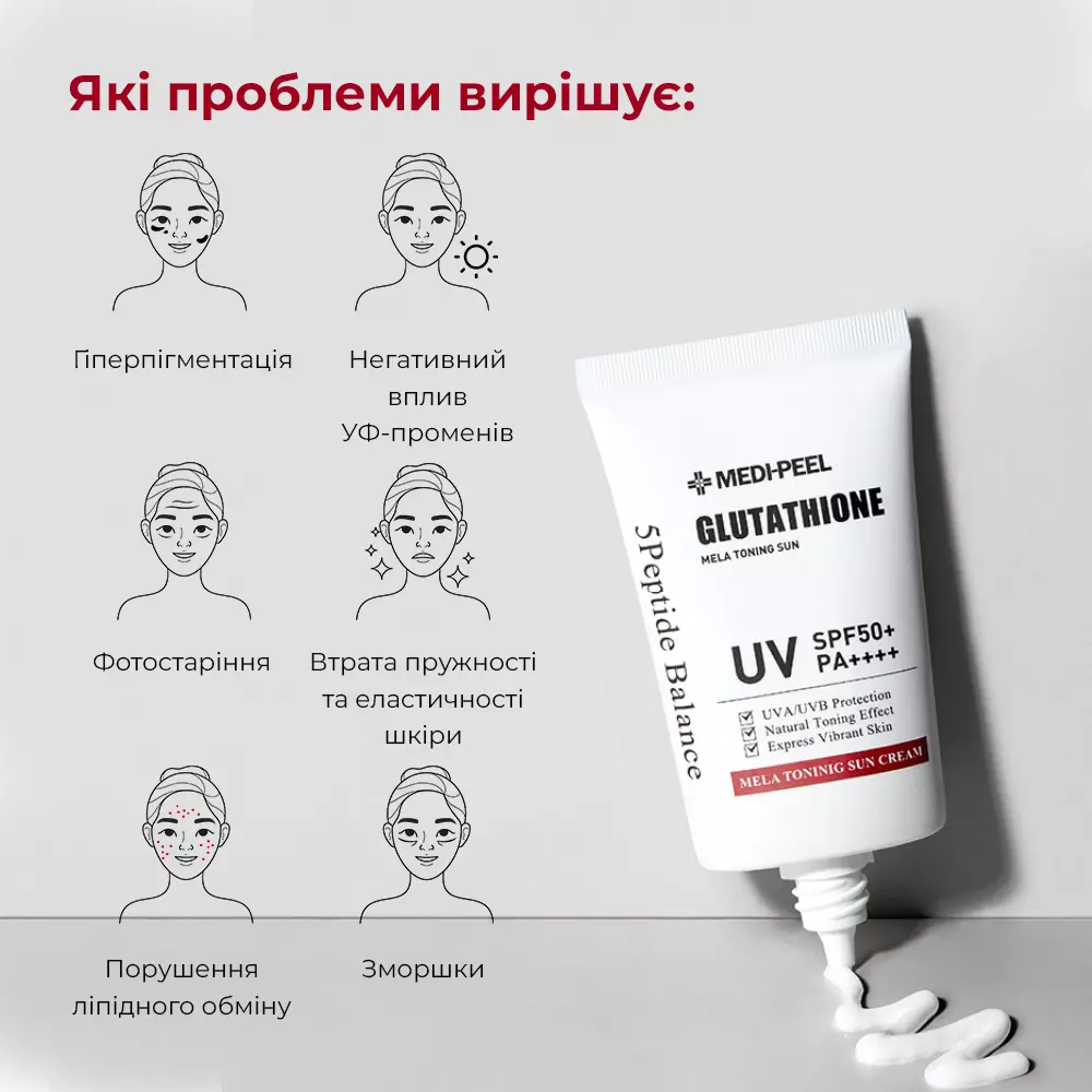 Поширені запитання про MEDIPEEL Bio-Intense Glutathione Mela Toning Sun Cream SPF 50+ PA++++