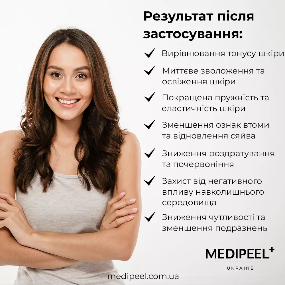 ☝️ Продукція Medi Peel проходить низку лабораторних досліджень, щоб підтвердити, що вона є безпечною та ефективною для дівчат. Але від індивідуального несприйняття певних інгредієнтів у формулі продуктів ніхто не застрахований. Щоб убезпечити себе та зробити досвід використання косметики позитивним, і головне – не нашкодити своєму здоров’ю, завжди проводьте такий тест перед додаванням будь-якого косметичного засобу у щоденні ритуали краси.