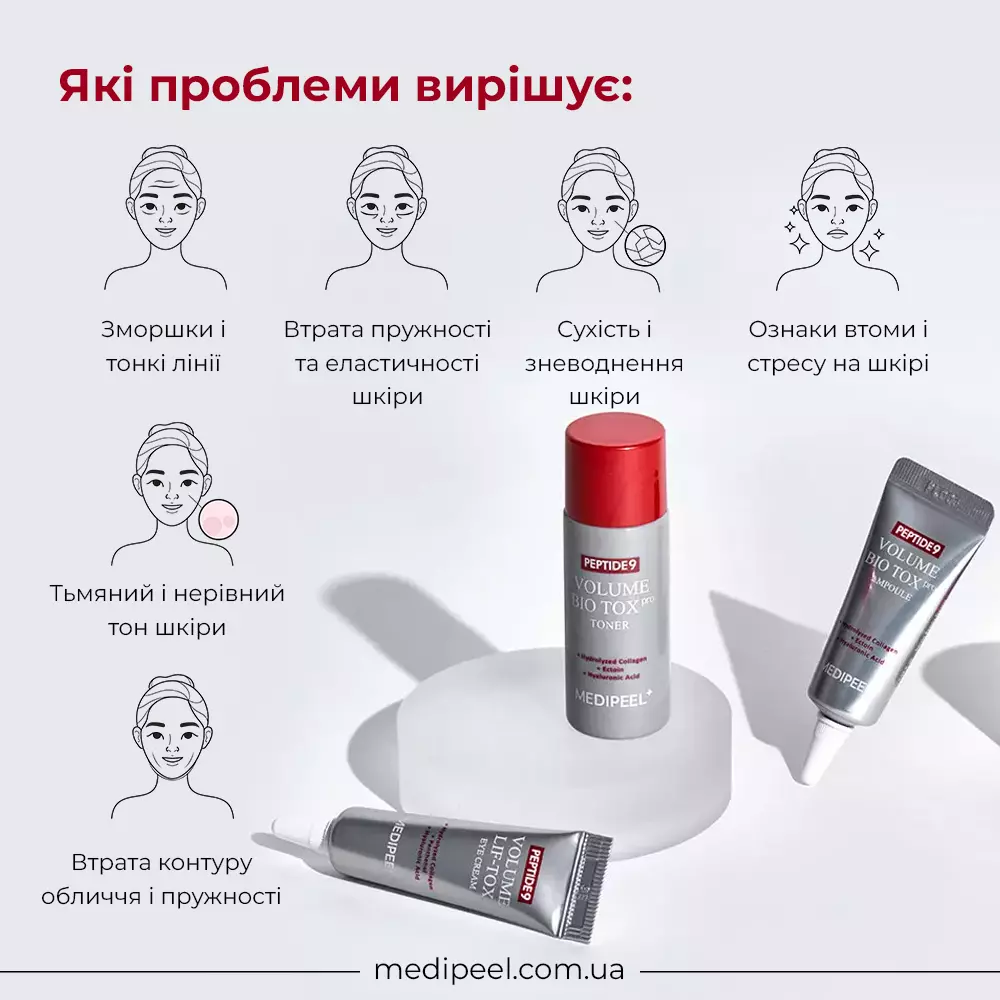 - Тонер для обличчя Peptide 9 Volume Bio Tox Toner Pro (20 мл): Освіжає і готує шкіру, максимально розкриваючи потенціал подальших засобів догляду.