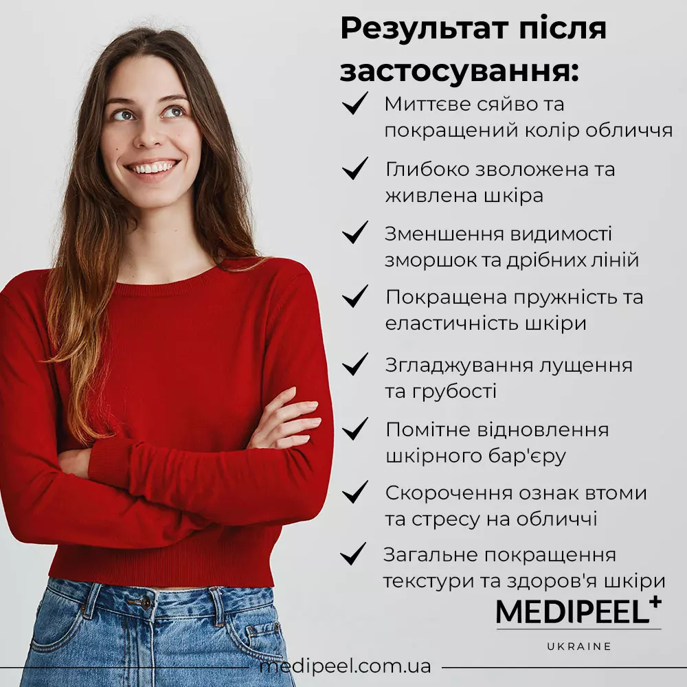 ☝️ Продукція Medi Peel проходить низку лабораторних досліджень, щоб підтвердити, що вона є безпечною та ефективною для дівчат. Але від індивідуального несприйняття певних інгредієнтів у формулі продуктів ніхто не застрахований. Щоб убезпечити себе та зробити досвід використання косметики позитивним, і головне – не нашкодити своєму здоров’ю, завжди проводьте такий тест перед додаванням будь-якого косметичного засобу у щоденні ритуали краси.
