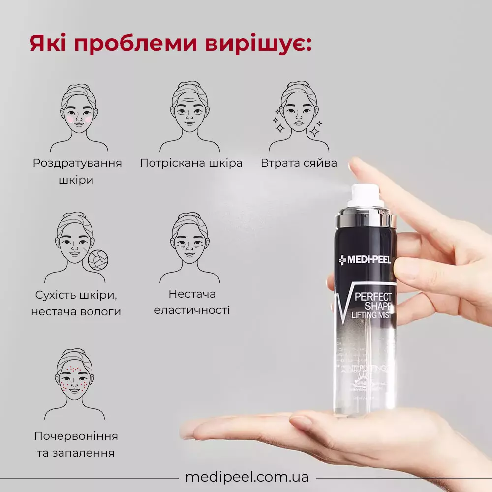 MEDIPEEL V Perfect Shape Lifting Mist - идеальное решение для тех, кто ищет мгновенное увлажнение и освежающий эффект. Благодаря своему богатому составу, этот тоник помогает поддерживать кожу увлажненной, здоровой и сияющей каждый день.