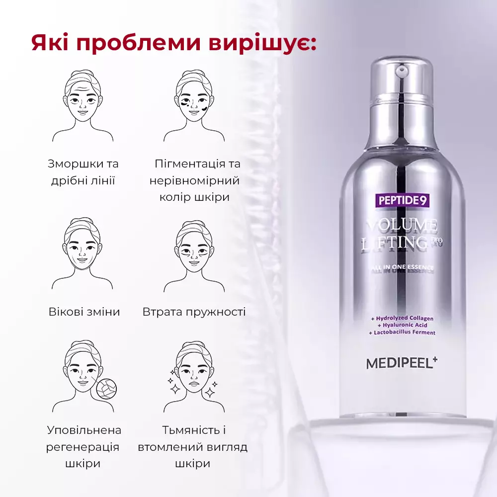 Medi-Peel Peptide 9 Volume Lifting All In One Essence Pro - идеальный выбор для тех, кто стремится сохранить молодость и свежесть своей кожи. Продукт предназначен для современных украинских женщин, которые ищут эффективное и инновационное решение в уходе за кожей лица.