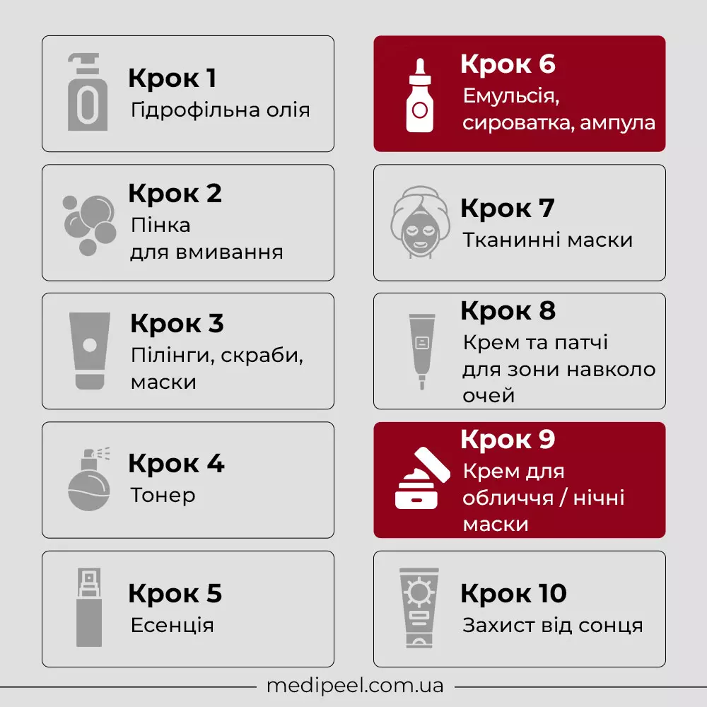 ☝️ Продукция Medi Peel проходит ряд лабораторных исследований, чтобы подтвердить, что она является безопасной и эффективной для девушек. Но от индивидуальной непереносимости определенных ингредиентов в формуле продуктов никто не застрахован. Чтобы обезопасить себя и сделать опыт использования косметики положительным, и главное - не навредить своему здоровью, всегда проводите такой тест перед добавлением любого косметического средства в ежедневные ритуалы красоты.