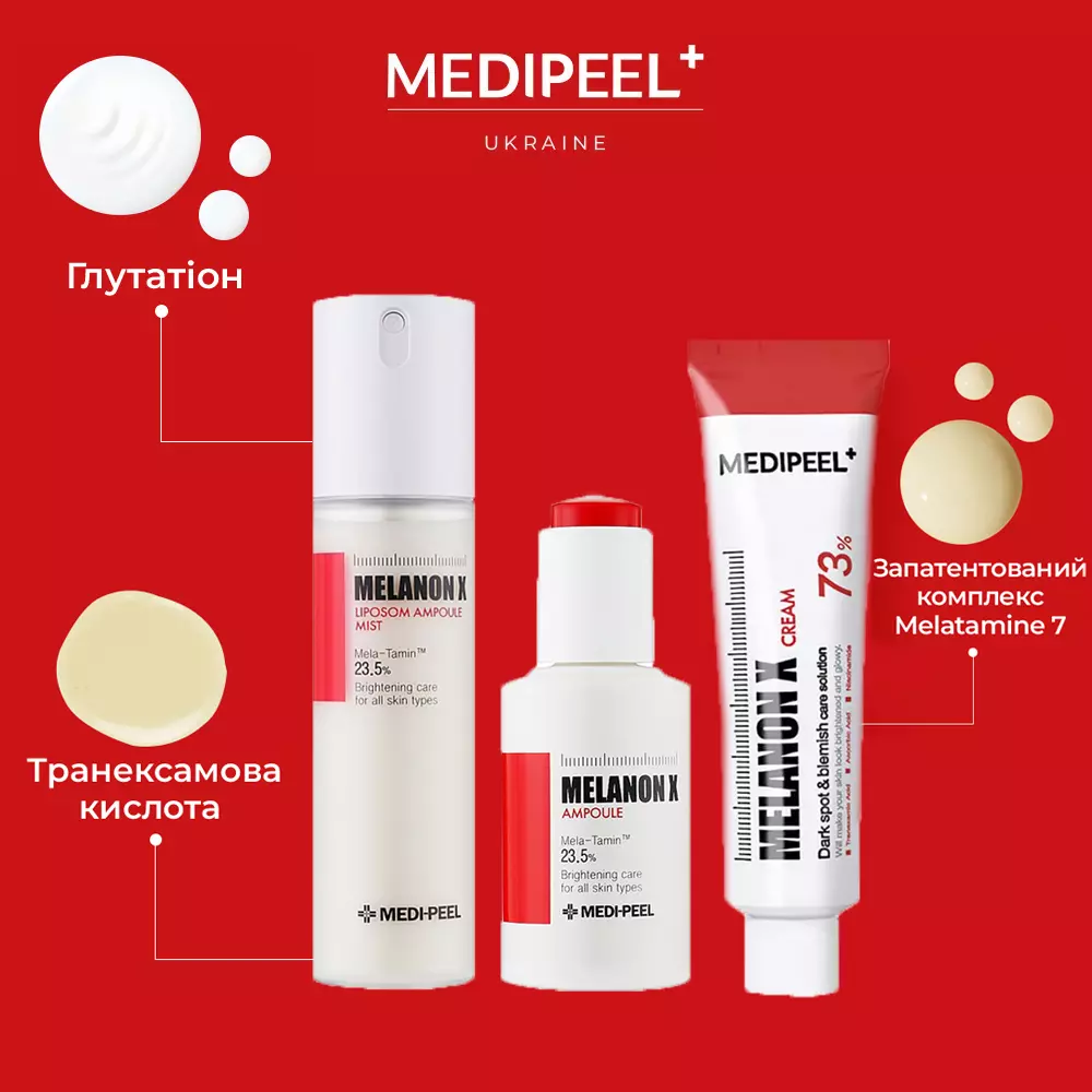 - MEDIPEEL Melanon X Ampoule - это концентрированная ампула, которая проникает в глубокие слои кожи, эффективно борется с гиперпигментацией, выравнивает тон кожи и восстанавливает ее естественное сияние.