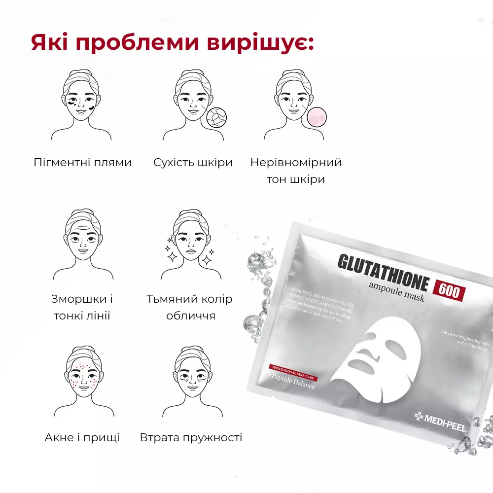 Маска для лица Medi-Peel Bio-Intense Glutathione White Ampoule Mask имеет несколько преимуществ, которые делают её выдающимся продуктом для ухода за кожей: