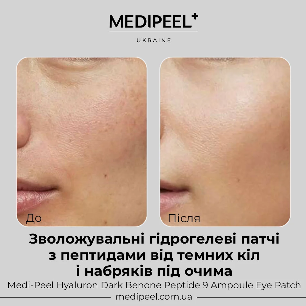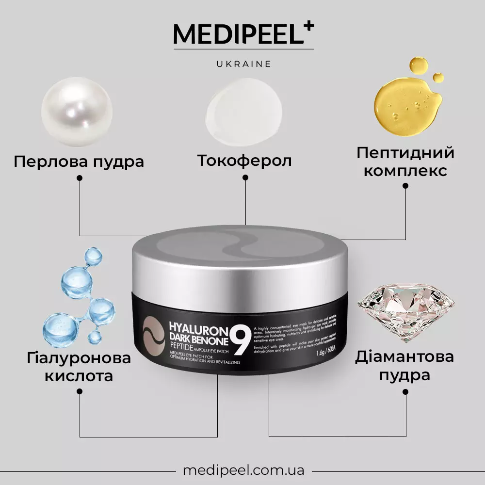 Medi-Peel Hyaluron Dark Benone Peptide 9 Ampoule Eye Patch - осветляющие патчи для глаз, обогащенные пептидами, берут на себя борьбу с темными кругами и отеками, деликатно осветляют и освежают кожу вокруг глаз.