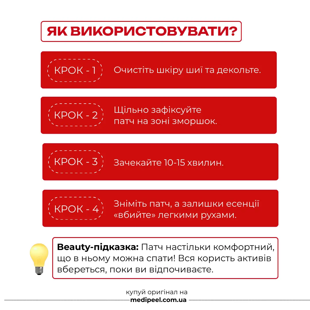 ☝️ Продукция Medi Peel проходит ряд лабораторных исследований, чтобы подтвердить, что она является безопасной и эффективной для девушек. Но от индивидуальной непереносимости определенных ингредиентов в формуле продуктов никто не застрахован. Чтобы обезопасить себя и сделать опыт использования косметики положительным, и главное - не навредить своему здоровью, всегда проводите такой тест перед добавлением любого косметического средства в ежедневные ритуалы красоты.